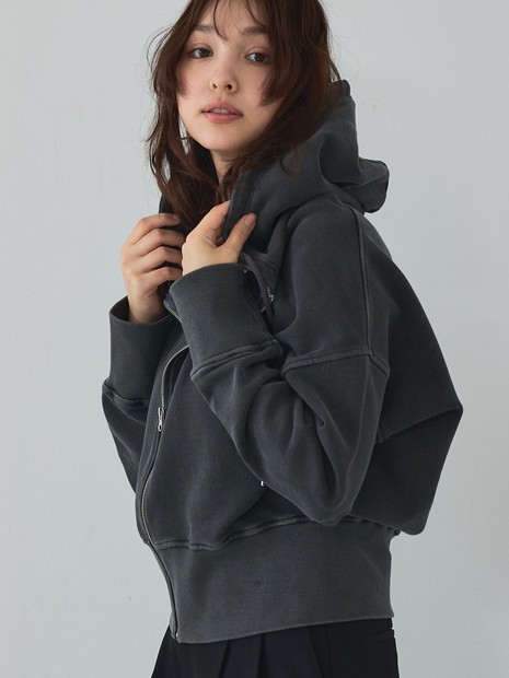ヴィンテージ風ピグメント裏毛のショートジップパーカー。ゆったり感あるシルエットでこなれ見えし、軽アウター感覚で春まで長く活躍する一枚。