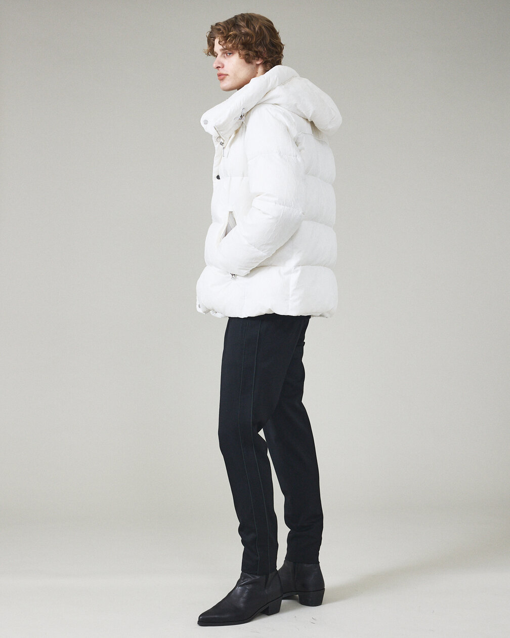 ウエストゴムやドローコード仕様による快適な穿き心地と、5351 POUR LES HOMMES ならではのシャープなシルエットを両立したイージーパンツはリラックス感のある仕様でありながら、落ち感のある素材と計算されたパターンにより、カジュアルに見えすぎないモードな印象に仕上げています。