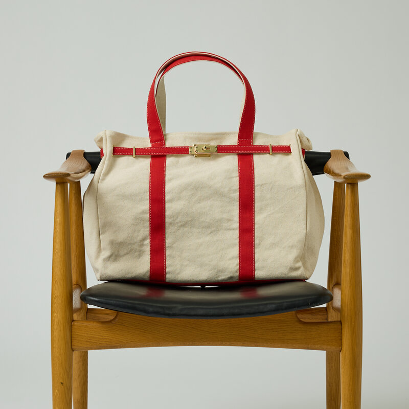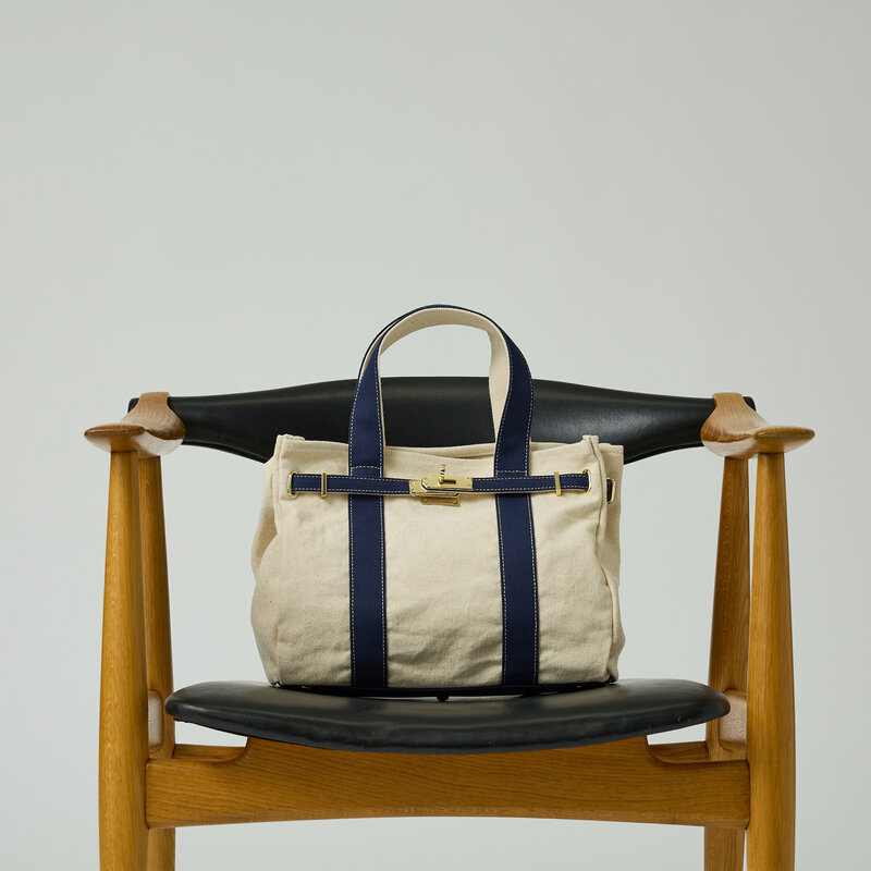 コントラストカラーのキャンバステープが目を惹くデザイン。