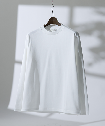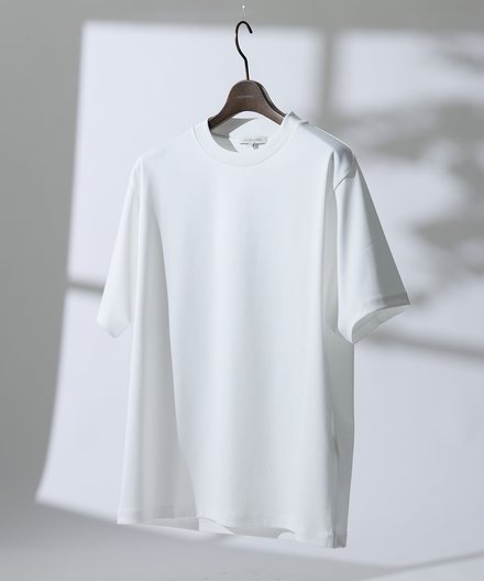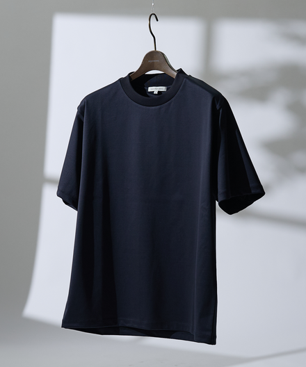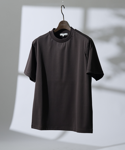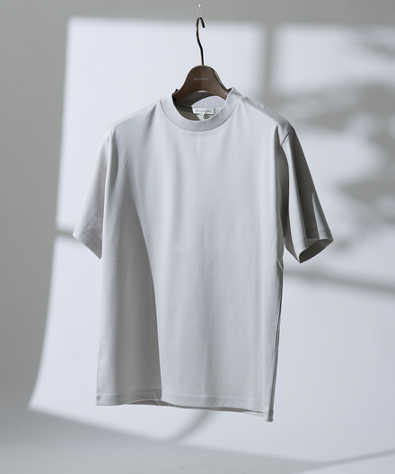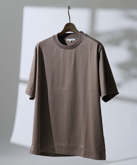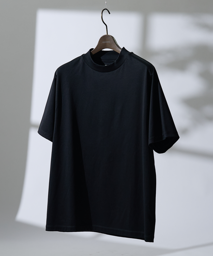 モックネックとハイバック設計により、首元に自然な立体感を生み出す一枚。ジャケットのインナーとしても美しく収まり、装いを上品に整えます。一枚で着てもラフになりすぎず、シンプルでありながら完成された印象に。日常からビジネスシーンまで、幅広く活躍するTシャツです。